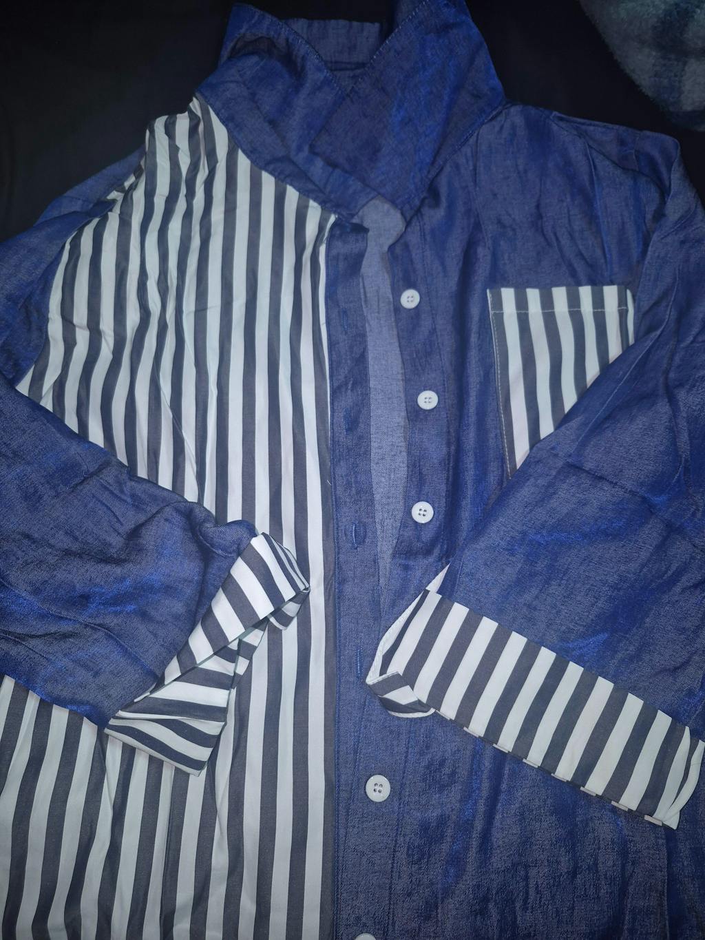 Chic Contrast Navy & Striped Button-Up Shirt – Effortless Style & Elegance