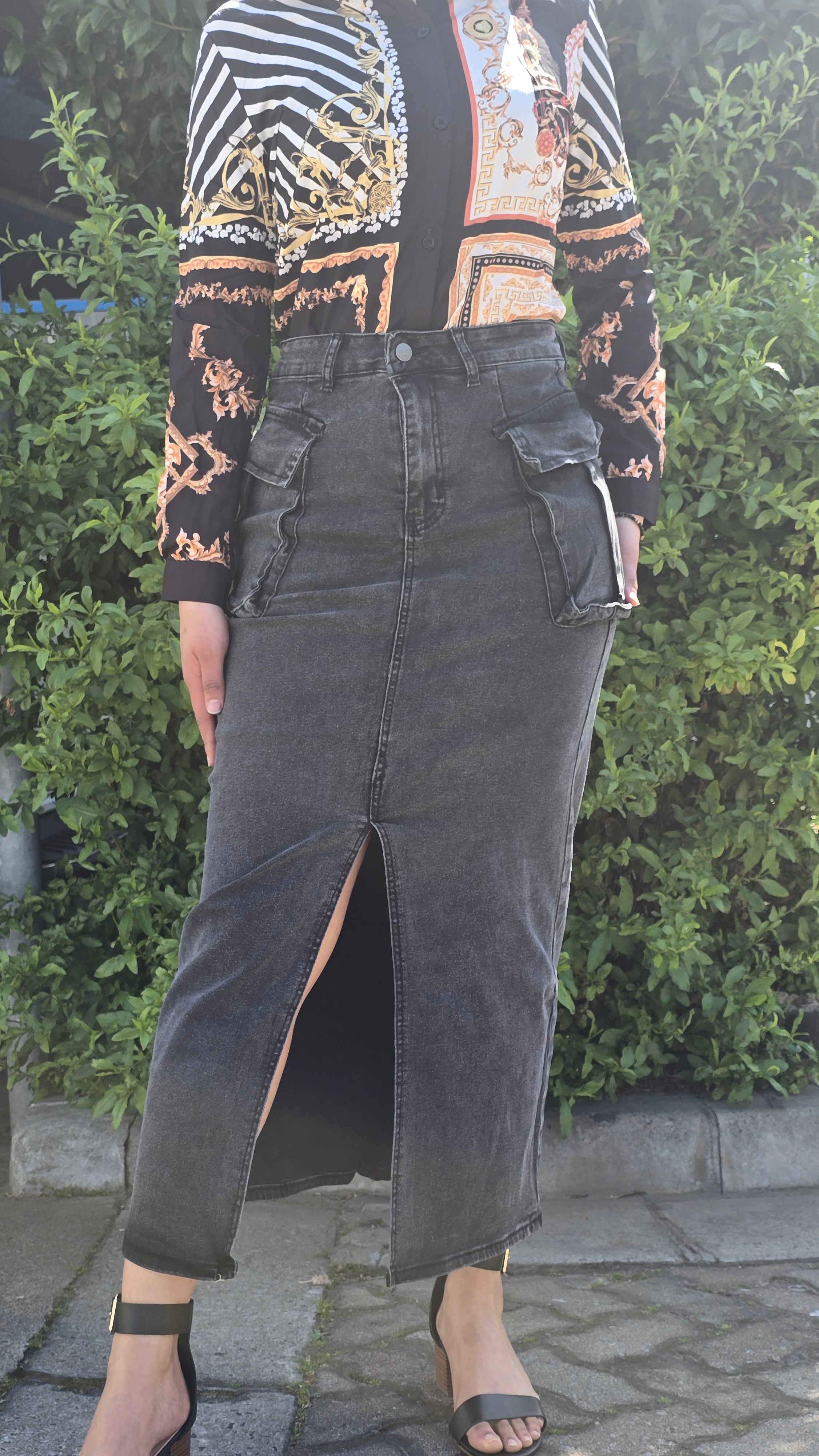 Grey High-Waist Denim Skirt with Cargo Pockets DYQ-349