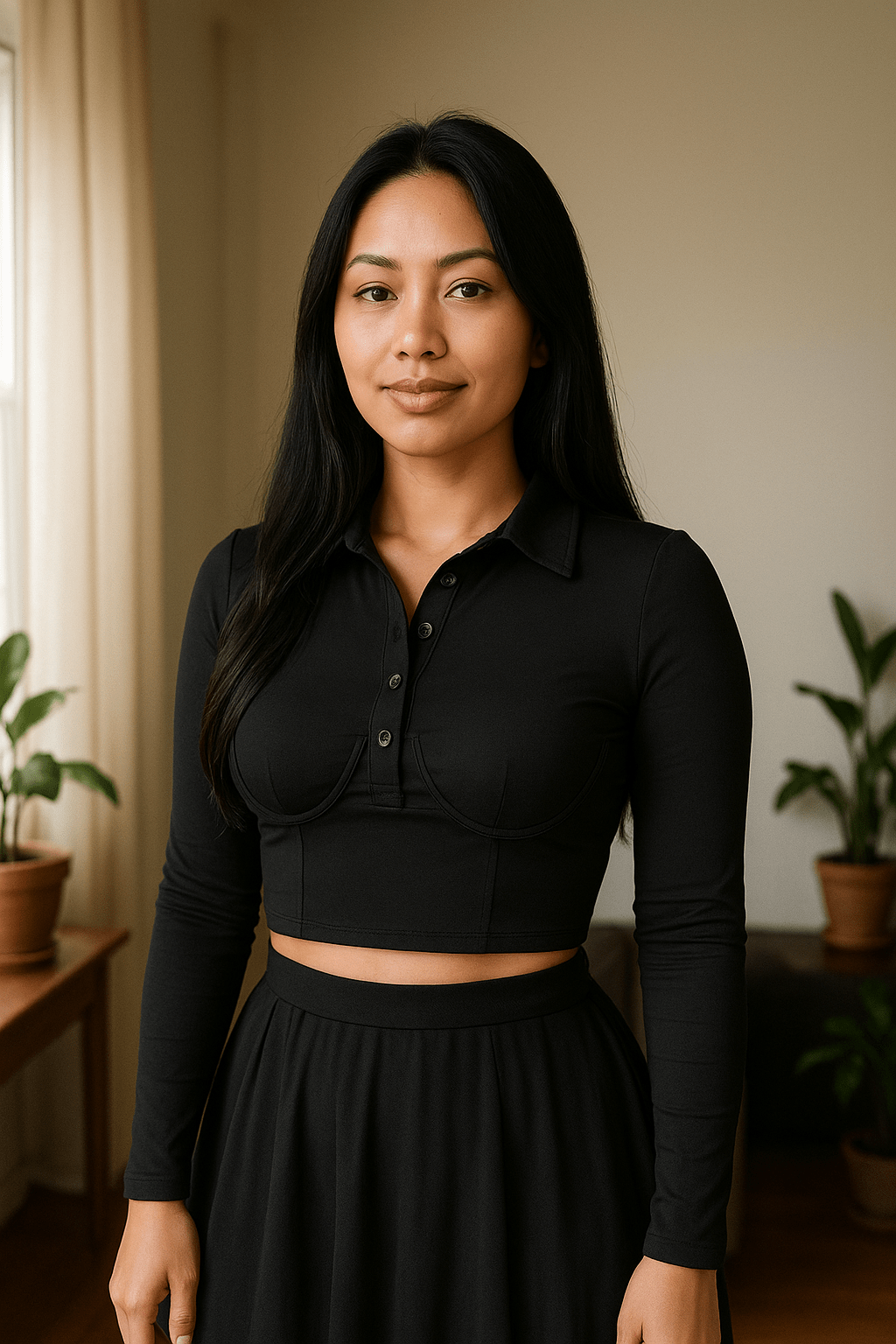 Solid Long Sleeve Collar Cropped T-Shirt